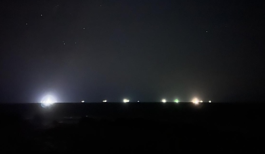Anoche luego de la intensa tormenta que azotó la zona se pudo ver una verdadera estela de luces iluminando la rada. Gran parte de esos buques tiene pedido de giro para el puerto local.