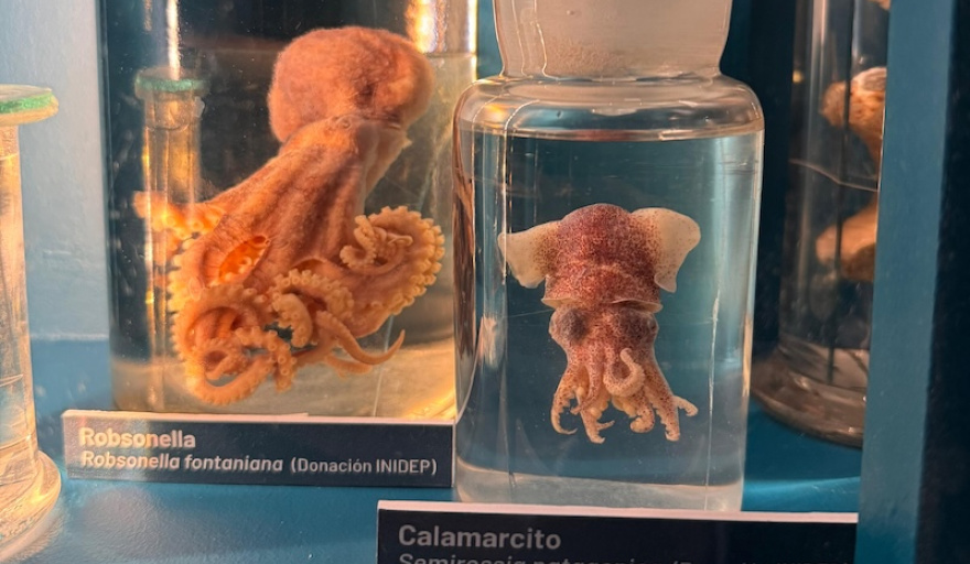 La exhibición dedica un sector a la fauna de las Islas Malvinas en el que están a la vista los ejemplares de calamar verrugoso (Onykia ingens), robsonella (Robsonella fontanianus), calamarcito (Semirossia patagonica), calamarete patagónico (Doryteuthis gahi) y pulpo colorado (Enteroctopus megalocyathus), donados por el Instituto en septiembre de 2024.