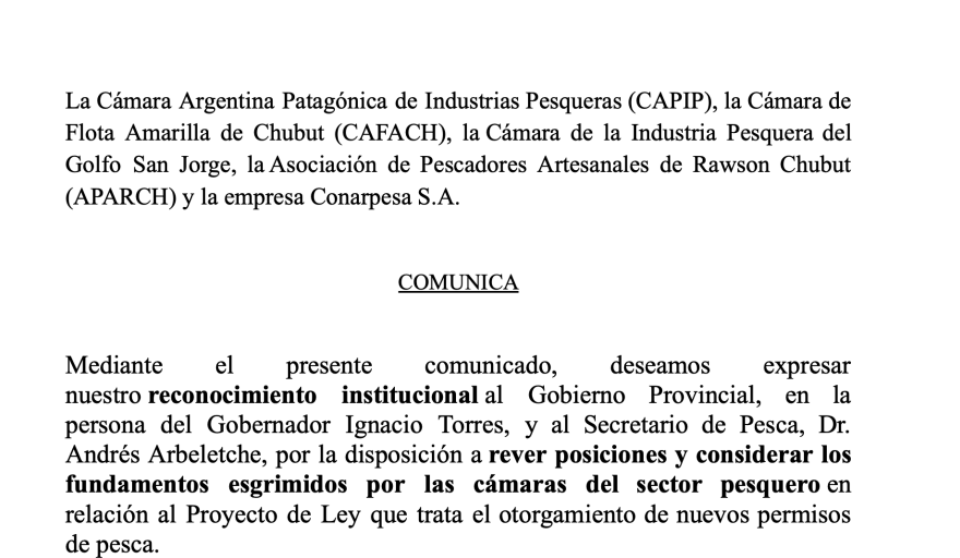Las principales entidades vinculadas a la actividad pesquera de la provincia —la Cámara Argentina Patagónica de Industrias Pesqueras (CAPIP), la Cámara de Flota Amarilla de Chubut (CAFACH), la Cámara de la Industria Pesquera del Golfo San Jorge, la Asociación de Pescadores Artesanales de Rawson (APARCH) y la empresa Conarpesa S.A.— expresaron su reconocimiento al Gobierno del Chubut por la decisión de revisar el proyecto de ley que proponía el otorgamiento de nuevos permisos de pesca.