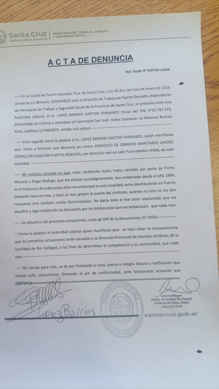 La denuncia fue presentada por el marinero Gastón López Barrios, quien se presentó en la oficina laboral para dejar constancia de la violencia verbal que —según manifestó— sufrió por parte de los delegados Rodrigo Rogel y Marcelo Flores.