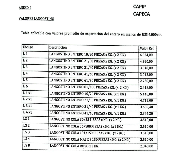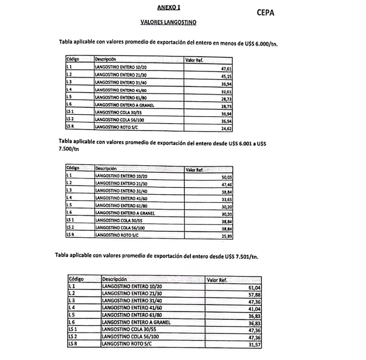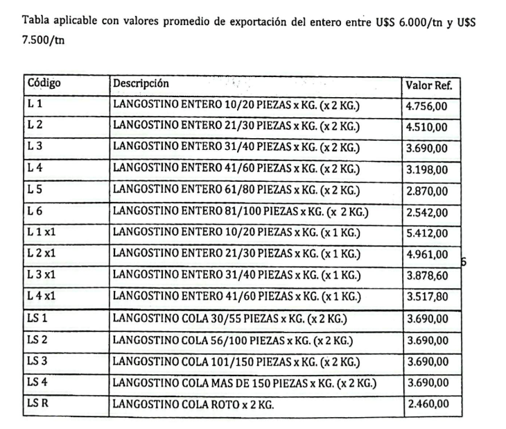 En cuanto al mecanismo de liquidación salarial, la propuesta establece que el salario por producción se calcule en función del tonelaje neto de langostino congelado descargado, sin incluir envases ni agua, multiplicado por valores de referencia por tonelada según tamaño y tipo de procesamiento. A ese resultado se le aplicaría el porcentaje del dólar previsto en cada convenio colectivo, tomando como referencia la cotización tipo comprador del Banco Nación del día de la descarga, además del porcentaje correspondiente a cada categoría laboral.