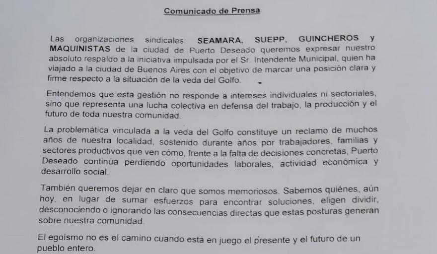 Las organizaciones sindicales SEAMARA, SUEPP, Guincheros y Maquinistas de Puerto Deseado manifestaron su “absoluto respaldo” a la iniciativa impulsada por el intendente municipal, quien viajó a la ciudad de Buenos Aires con el objetivo de fijar una postura firme respecto a la problemática de la veda del Golfo.