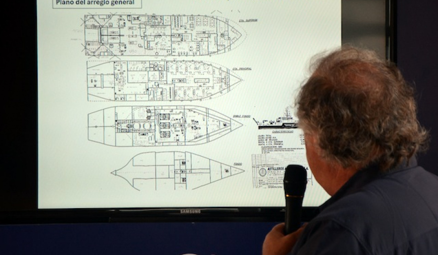 Especificaciones técnicasAsimismo, en la charla se brindaron especificaciones sobre el Equipo de Cubierta: maquinillas de pesca y científicas, y el Equipamiento Científico integrado por EC de casco, equipos de tratamiento de datos, equipo oceanográfico, circuito de circulación de agua de mar no contaminada, estación meteorológica, Rov, equipos de análisis químicos y de fitoplancton y equipos biológicos.