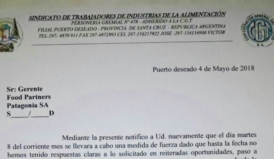 Operarios pesqueros que realizan el procesamiento de centolla fresca proveniente de los barcos Cristo Redentor y Patagonia decidieron iniciar en el día de hoy una medida de fuerza ante la falta de respuestas de los directivos de la empresa Food Prtners a los distintos planteos efectuados a través de la autoridad laboral.